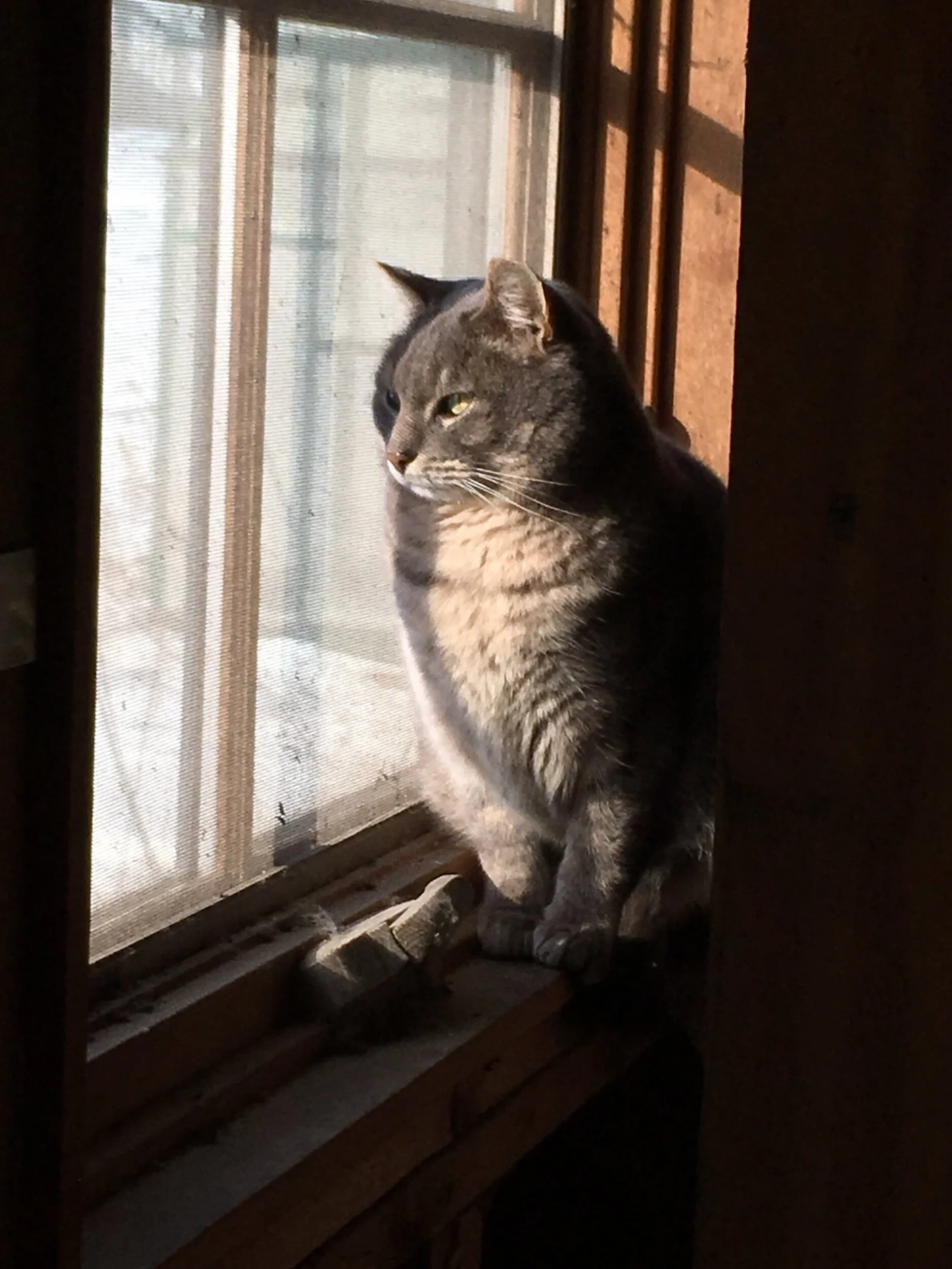Former feral cat, Touchstone, basking in the a sunny window in his barn